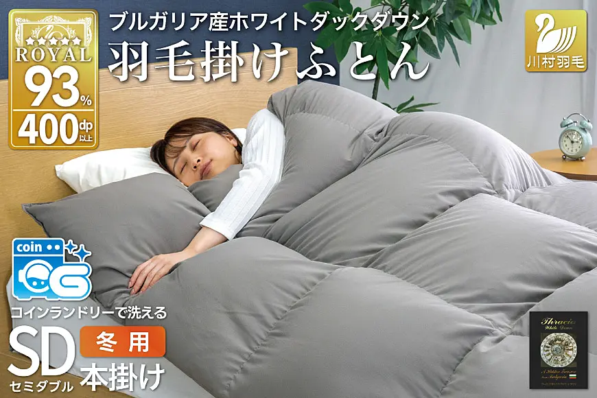 洗える羽毛布団 セミダブル ホワイトダックダウン93% グレー 無地 本掛け 冬用 1.5kg [川村羽毛 20745107]