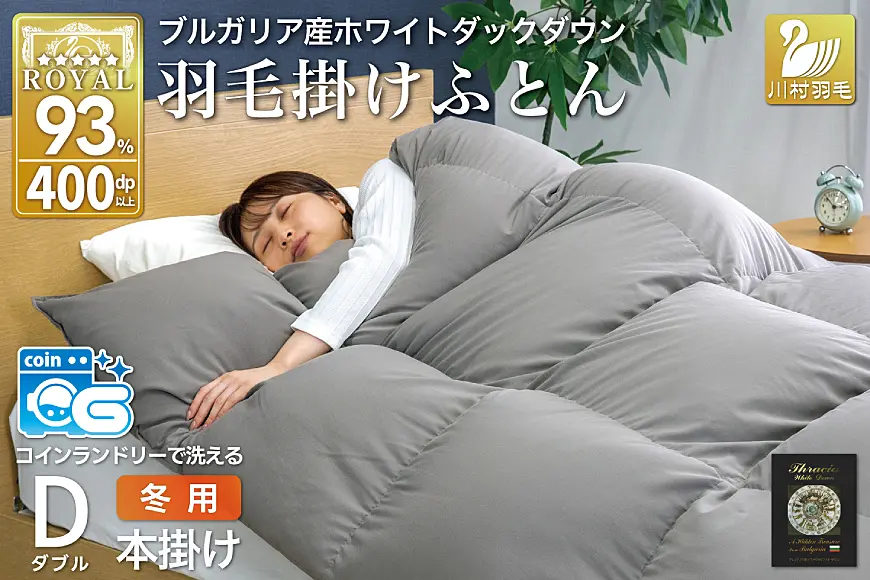 洗える羽毛布団 ダブル ホワイトダックダウン93% グレー 無地 本掛け 冬用 1.7kg [川村羽毛 20745106]
